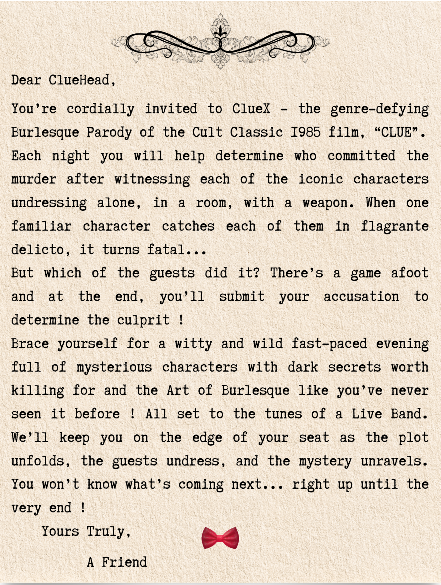 CLUE X | A Burlesque Parody of the Classic Film Fridays, Saturdays, and Sundays MARCH 13TH through APRIL 25TH - 7:30pm SHARP!